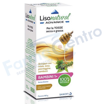 Descrizione Dispositivo medico indicato per la tosse secca e grassa e in particolare quella che accompagna le infezioni delle alte vie aeree. Agisce con un’azione meccanica sulla mucosa irritata attraverso due meccanismi: - favorisce l’idratazione del muco facilitandone la fisiologica rimozione; - forma una "pellicola" che protegge la mucosa dal contatto con gli agenti esterni irritanti. L’azione di Lisonatural Advance agisce grazie al complesso Poliflav M.A. costituito da una frazione polisaccaridica che agisce in sinergia con il miele per l'azione mucoadesiva, e da una frazione flavonoidica ad azione antiossidante che, insieme agli antociani del sambuco (questi solo nella formulazione per bambini), contribuisce alla protezione della mucosa. Lisonatural Advance è 100% naturale ed è formulato senza l'impiego di conservanti, coloranti ed altri eccipienti di sintesi. 100% naturale e formulato senza l’impiego di conservanti, coloranti ed altri eccipienti di sintesi. Gli aromi naturali di mora e fragola rendono il gusto del prodotto particolarmente gradevole, aspetto importante per facilitare l’assunzione da parte del bambino. Modalità d'uso - Bambini da 1 a 6 anni: 1 cucchiaino dosatore (5 ml) da assumere 2 volte nell’arco della giornata. - Bambini sopra i 6 anni: 2 cucchiaini dosatori (10 ml) da assumere 2 volte nell’arco della giornata. In caso di necessità il prodotto può essere assunto fino a 4 volte al giorno, anche a distanza ravvicinata. Agitare prima dell’uso. Una volta aperto, chiudere bene il flacone dopo l’uso. Lavare accuratamente il cucchiaino dopo ogni singolo utilizzo. La formazione di un lieve deposito è dovuta alla composizione naturale dello sciroppo e non altera la qualità del prodotto. Se i sintomi persistono per più di qualche giorno consultare un medico. Componenti Complesso Poliflav M.A.: frazione polisaccaridica da piantaggine e frazione flavonoidica da timo., miele, sambuco succo concentrato, zucchero di canna, acqua, succo di limone, aromi naturali di mora e fragola, gomma xanthan, gomma arabica. Ciascun cucchiaino dosatore (5 ml) contiene circa 4,5 g di zucchero. Senza glutine. Avvertenze Non utilizzare se presente ipersensibilità o allergia individuale verso uno o più componenti. Tenere fuori dalla portata dei bambini. Conservazione Conservare a temperatura ambiente lontano da fonti di calore e al riparo dalla luce. Non utilizzare dopo la data di scadenza. Validità post-apertura: 3 mesi. Formato Flacone da 180 g.